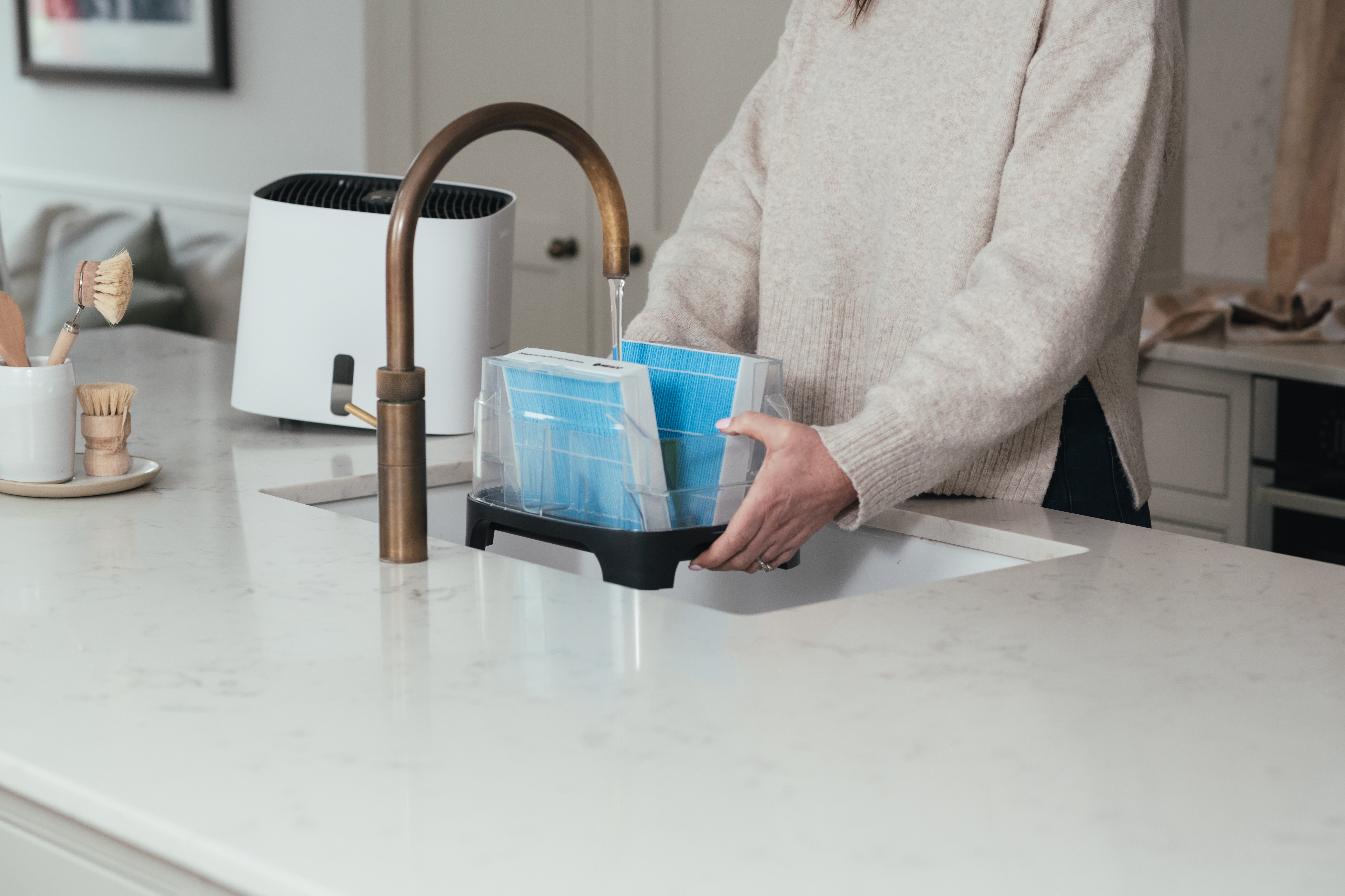 Armin bevochtigt met puur kraanwater Armin 300 bevochtigt de lucht met zuiver water. Vul hem met puur kraanwater, het water heeft geen speciale behandeling nodig. Het toevoegen van een middel voor waterbehandeling is niet nodig. Armin is weinig gevoelig voor kalk in het water. Hij is te gebruiken in gebieden met zacht water en met hard water. De verdampingsbevochtiger verhoogt de vochtigheidsgraad zoals de natuur doet. Een ventilator blaast lucht langs de vochtige verdampingsfilters, dit is te vergelijken met wind die over de zee blaast. Het water in het reservoir van Armin 300 blijft vrij van bacteriën en algen dankzij de Silvertex® watersterilisatiepad, gecombineerd met een antimicrobiële coating op de verdampingsfilters. Dubbele aanzuiging van droge lucht, twee verdampingsfilters Armin 300 verhoogt de luchtvochtigheid snel en gelijkmatig. De bevochtiger is uitgerust met twee verdampingsfilters. Droge lucht wordt aan beide zijde van het apparaat langs een vochtig filter gevoerd. Na het bevochtigen wordt de geconditioneerde lucht in één luchtstroom in de kamer verdeeld. Omdat de bevochtiger de droge lucht aan twee kanten van het apparaat aanzuigt, zal de hele kamer sneller de goede luchtvochtigheid krijgen. Schone lucht, vrij van kalk De dubbele verdampingsfilters in Armin 300 nemen vocht uit het waterreservoir op, en verdelen dit in de droge omgevingslucht. Tijdens dit proces blijven kalkdeeltjes op het filter achter waardoor ze niet in de omgeving terecht komen. Armin veroorzaakt dus geen witte neerslag in de kamer. Armin's verdampingsfilters hebben een lange levensduur. Ze kunnen tot vier keer worden gedraaid, waardoor hun levensduur wordt gemaximaliseerd voordat vervanging nodig is. Silvertex® watersterilisatiepad Armin is de enige Europese luchtbevochtiger die gebruik maakt van de innovatieve watersterilisatiepad Silvertex®, deze is gemaakt van puur zilver en PET. Silvertex® laat zilverionen vrij in het water, waardoor de groei van ziektekiemen en micro-organismen wordt voorkomen. Dit zorgt ervoor dat het water zuiver blijft en voorkomt dat bacteriën zich verspreiden in de lucht die u inademt. Met een levensduur van maximaal een jaar levert Silvertex® langdurige, betrouwbare prestaties voor een gezondere omgeving. Kenmerken van Meaco Armin 300 Ingebouwde hygrostaat Dubbele aanzuiging van droge lucht Weinig onderhoud Makkelijk van bovenaf te vullen Gemakkelijk schoonmaken Vaatwasserbestendige watertank Hoge verdampingssnelheid Laag geluidsniveau Nachtmodus Energiezuinig Silvertex® watersterilisatiepad Antimicrobiële coating op verdampingsfilters Intuïtieve bediening met 3 standen