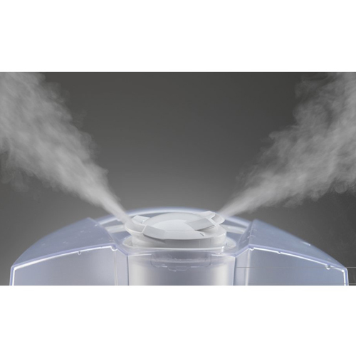 Ultrasone luchtbevochtiger Boneco U7147 met digitale bediening. Ultrasone bevochtiging in stijl, met voorverwarming voor extra comfort. Boneco U7147 heeft een mooi display met verschillende indicatoren. Zijn antikalk filter zorgt voor schone bevochtiging. Luchtbevochtiger Boneco U7147 blaast fijn verdeelde nevel in het binnenmilieu. De nevel ontstaat doordat het water uit zijn reservoir in een speciaal compartiment aan trillingen wordt blootgesteld. Deze techniek maakt een ultrasone luchtbevochtiger zoals deze Boneco U7147 zeer krachtig. De luchtbevochtiger is uitgerust met voorverwarming. Als deze stand ingeschakeld is, zal het apparaat handwarme nevel verspreiden zodat de kamertemperatuur niet daalt*. Ten opzichte van een stoombevochtiger heeft de Boneco U7147 weinig stroom nodig voor het verwarmen van het water. Met de voorverwarming aan gebruikt de luchtbevochtiger 140 Watt, en zonder voorverwarming ongeveer 40 Watt. Het energieverbruik van een stoombevochtiger ligt aanzienlijk hoger. Luchtbevochtiger Boneco U7147 heeft een digitale bediening. Via het display is de gewenste luchtvochtigheid in te stellen. De bevochtiger verhoogt de luchtvochtigheid in korte tijd tot de ingestelde waarde en houdt deze vochtigheid automatisch in stand. Ook de nevel is regelbaar. De Boneco U7147 heeft een ontkalkingsfilter en een Boneco ionisatie stick die kalkvrij, hygiënisch lucht bevochtigen garanderen. De ultrasone luchtbevochtiger verbetert de leef- en werkomstandigheden in het binnenmilieu. Hij beschermt ook houten vloeren en meubelen tegen krimpen en scheuren. Eigenschappen van ultrasone luchtbevochtiger Boneco U7147 Zowel koele als warme verdamping mogelijk Door voorverwarming is er geen afkoeling van de omgevingstemperatuur Nieuw stijlvol ontwerp Ingebouwde hygrostaat voor het regelen van de bevochtiging Timer Regelbare nevel Indicator leeg reservoir Indicator systeem reinigen Transparant waterreservoir (waterhoeveelheid is goed zichtbaar) Ontkalkingspatroon met een hoge capaciteit Geruisloos Makkelijk in gebruik en eenvoudig schoon te maken *Bij gebruik van voorverwarming wordt het water verhit tot 80° C. De kamertemperatuur gaat niet omlaag omdat de nevel die het systeem verlaat een temperatuur heeft van 40° C.